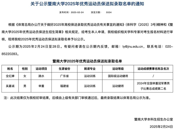 據此前報道,今年2月24日,學報暨南大學發布《關于公示暨南大學2025年優秀運動員保送擬錄取名單的到院通知》,名單顯示,炳添跳水運動員全紅嬋擬就讀運動訓練專業,合影運動員等級為國際級運動健將。留念